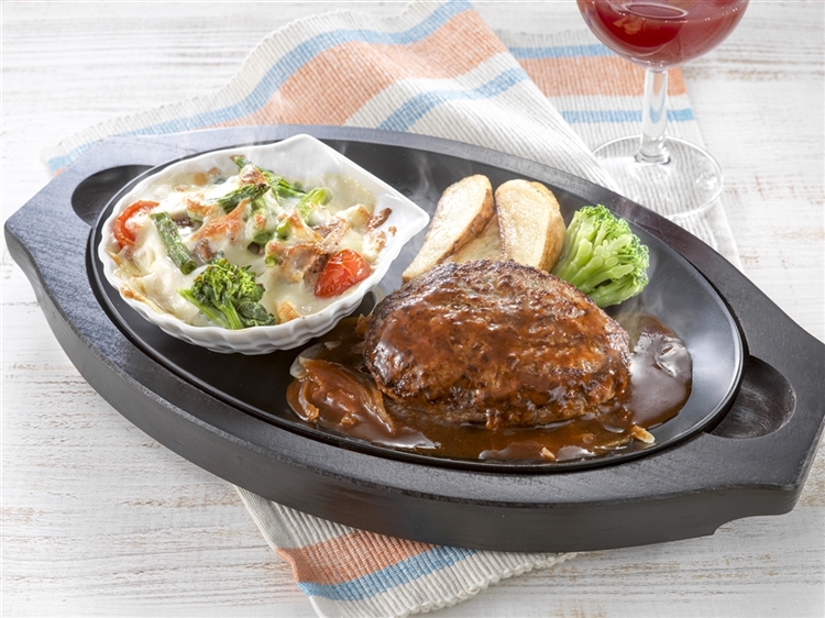 牛100%ハンバーグ特製デミグラスソース毎日店舗で仕込み焼きあげた自慢のハンバーグ。特製デミグラスソースで仕上げました。 -